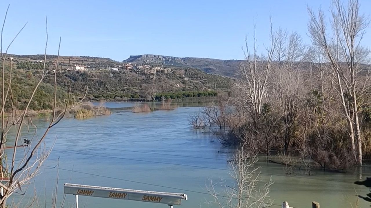 Antalya'da şiddetli yağışların ardından Oymapınar ve Manavgat barajlarından su bırakılması sonucu Manavgat Irmağı taşınca, Antalya-Alanya Otoban İnşaatı şantiyesi ve narenciye bahçeleri su altında kaldı.
