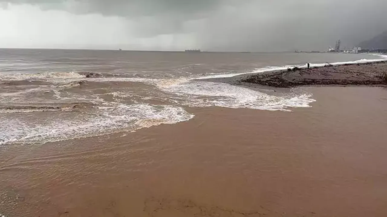 Antalya'da etkili olan şiddetli yağmur ve fırtınanın ardından taşan derelerin getirdiği alüvyonlar nedeniyle Konyaaltı Sahili'nde denizin rengi kahverengiye döndü.