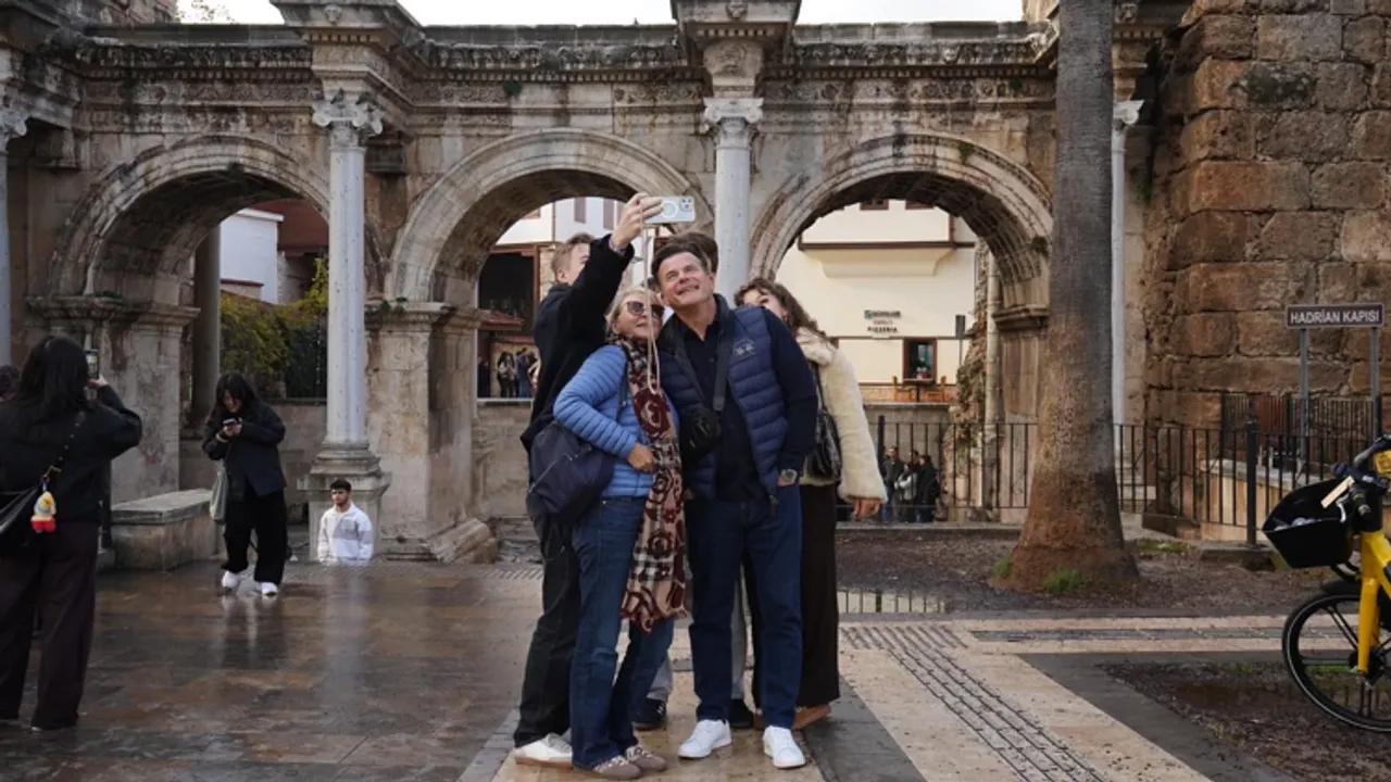 Yılın son gününü Antalya'da geçirmek isteyen turistler, Hadrian Kapısı önünde fotoğraf çektirdi. Kaleiçi sokaklarında yürüyüş yapan ziyaretçiler, tarihi dokunun tadını çıkardı.