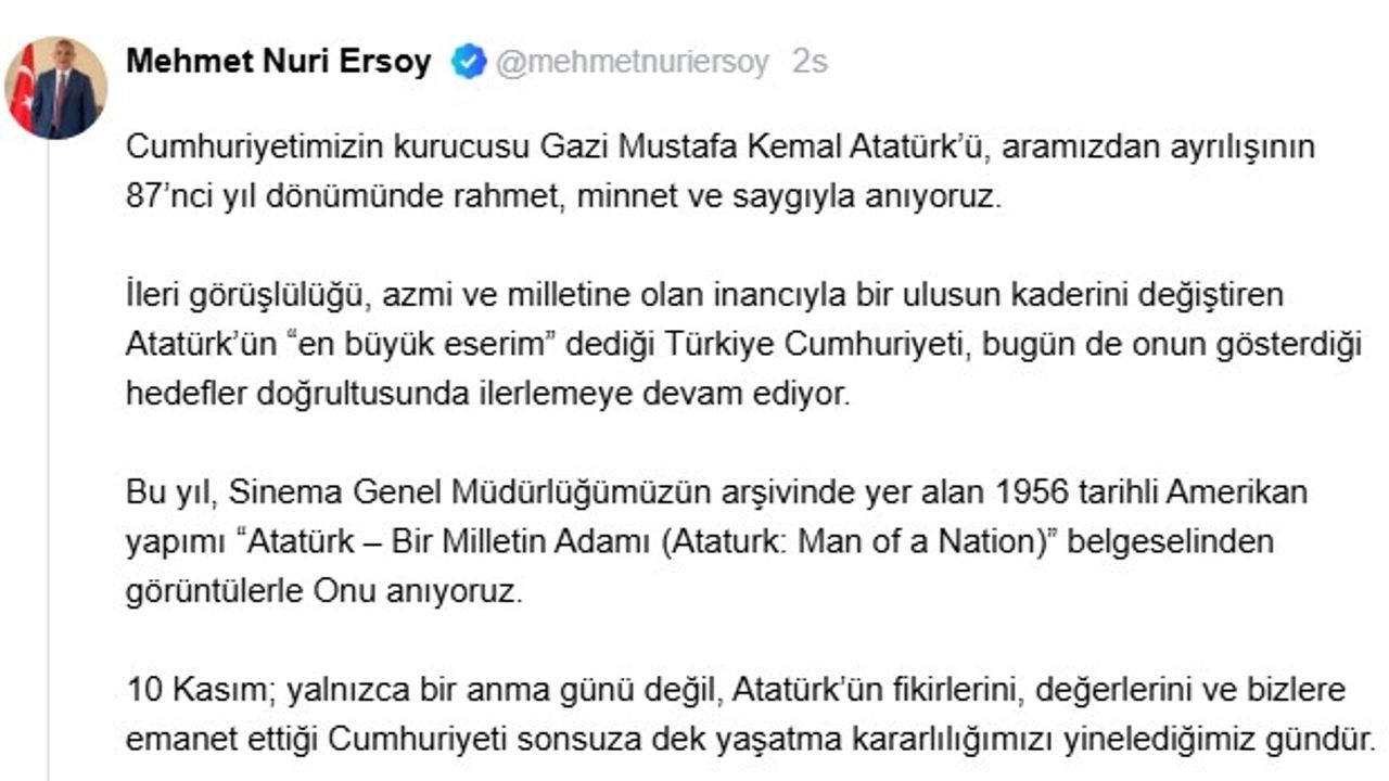 Bakan Ersoy, Atatürk'ü vefatının 87'nci yıl dönümünde, Atatürk'ün geçici istirahatgahından Anıtkabir'e taşınmasına ilişkin görüntülerle hazırlanan belgeselin bir bölümünü sosyal medya hesabından paylaşarak andı. Ersoy, "İleri görüşlülüğü, azmi ve milletine olan inancıyla bir ulusun kaderini değiştiren Atatürk’ün ‘en büyük eserim’ dediği Türkiye Cumhuriyeti, bugün de onun gösterdiği hedefler doğrultusunda ilerlemeye devam ediyor. Bu yıl, Sinema Genel Müdürlüğümüzün arşivinde yer alan 1956 tarihli Amerikan yapımı ‘Atatürk -Bir Milletin Adamı (Ataturk: Man of a Nation)’ belgeselinden görüntülerle Onu anıyoruz. 10 Kasım; yalnızca bir anma günü değil, Atatürk’ün fikirlerini, değerlerini ve bizlere emanet ettiği Cumhuriyeti sonsuza dek yaşatma kararlılığımızı yinelediğimiz gündür" ifadelerini kullandı.