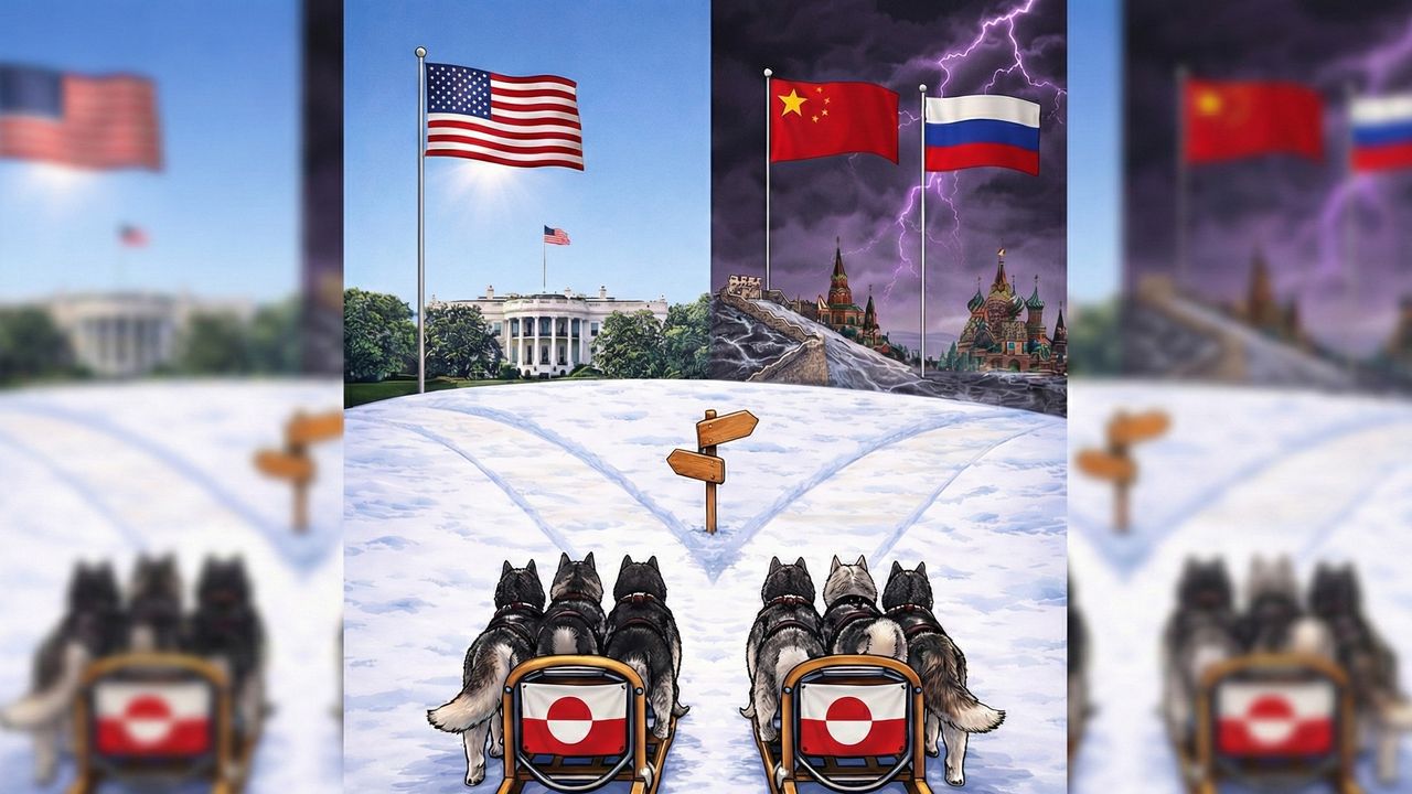 Paylaşılan görselde, üzerinde Grönland bayrağı bulunan köpek kızaklarının karlı bir arazide yol ayrımına geldiği tasvir edildi. Görselde Grönland'ın seçebileceği sol taraftaki yol; güneşli ve açık bir gökyüzü altında, Beyaz Saray'a ve dalgalanan ABD bayrağına çıkarken; sağ taraftaki yol ise fırtınalı ve karanlık bir gökyüzü altında, Çin ve Rusya bayrakları ile bu ülkelerin simgelerine (Çin Seddi ve Kremlin) doğru uzanıyor.