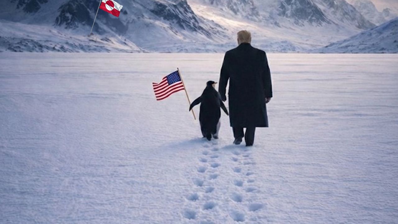 Beyaz Saray, ABD Başkanı Donald Trump'ın yanında Amerikan bayrağını tutan bir penguenle Grönland'a doğru yürüdüğü bir fotoğraf paylaştı.