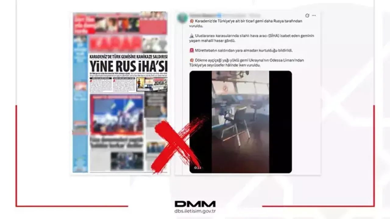 İletişim Başkanlığı Dezenformasyonla Mücadele Merkezi (DMM), 'Bazı sosyal medya hesaplarında 'Karadeniz'de Türkiye'ye ait bir ticari geminin vurulduğu' yönünde yeni bir olaymış gibi paylaşılan iddialar dezenformasyon içermektedir' açıklamasını yaptı.