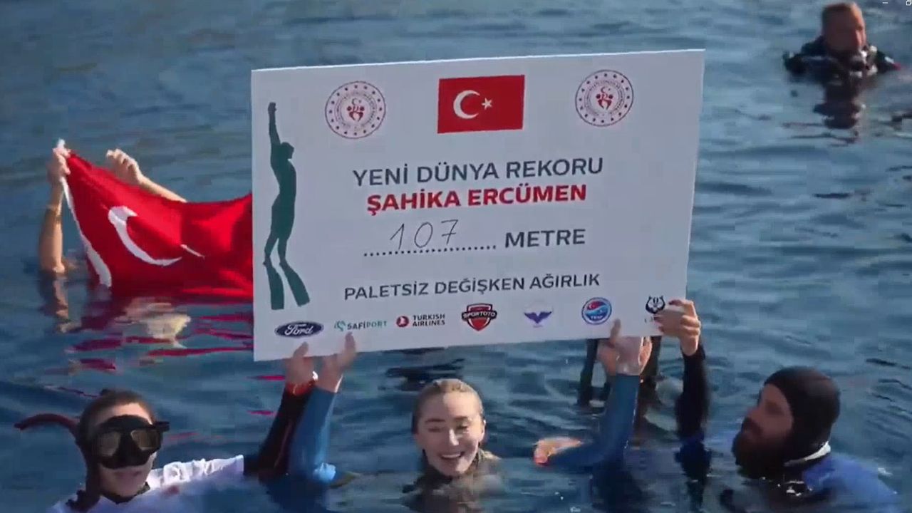 Serbest dalış dünya rekortmeni milli sporcu Şahika Ercümen, Antalya'nın Kaş ilçesinde gerçekleştirdiği 107 metrelik dalışla değişken ağırlık paletsiz kategorisinde kendisine ait olan dünya rekorunu kırdı.