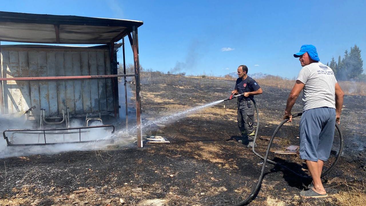 Akçaalan Mahallesi'ndeki boş arazide Kürşat Tufan'a ait güvercinlerin bulunduğu kulübede, henüz bilinmeyen nedenle yangın çıktı.