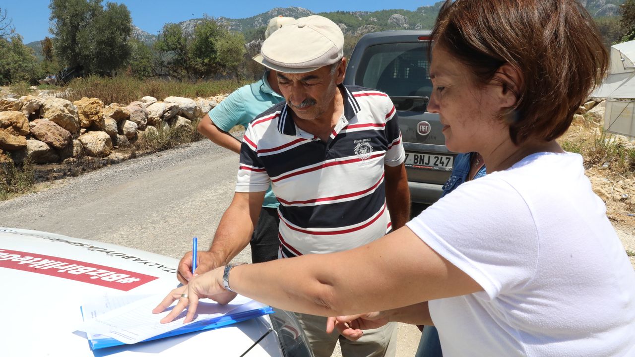 Antalya Büyükşehir Belediyesi ekipleri, Serik ilçesindeki önceki gün yaşanan orman yangını sonrası zarar gören tarım arazilerinde hasar tespit çalışması yaptı.