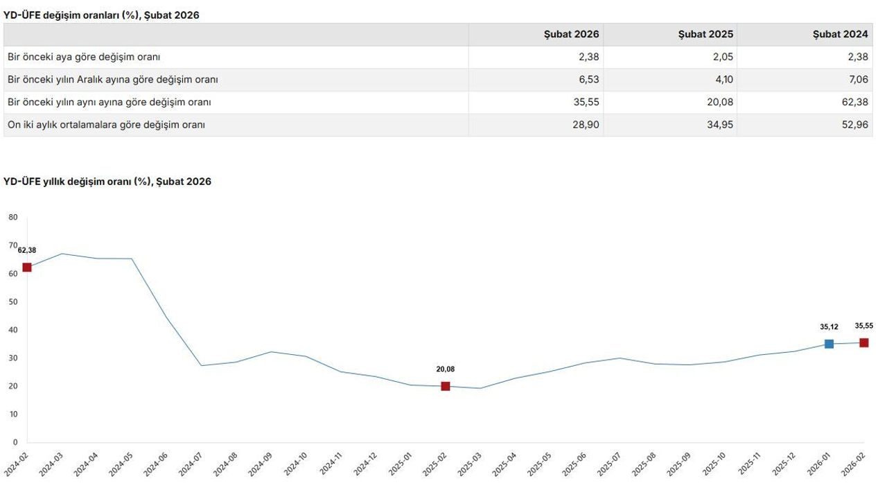 TÜİK, Şubat 2026 dönemine ilişkin yurt dışı üretici fiyat endeksi verilerini açıkladı. Buna göre; yurt dışı üretici fiyatları şubat ayında bir önceki aya göre yüzde 2,38, bir önceki yılın aralık ayına göre yüzde 6,53, bir önceki yılın aynı ayına göre yüzde 35,55 ve 12 aylık ortalamalara göre yüzde 28,90 arttı.