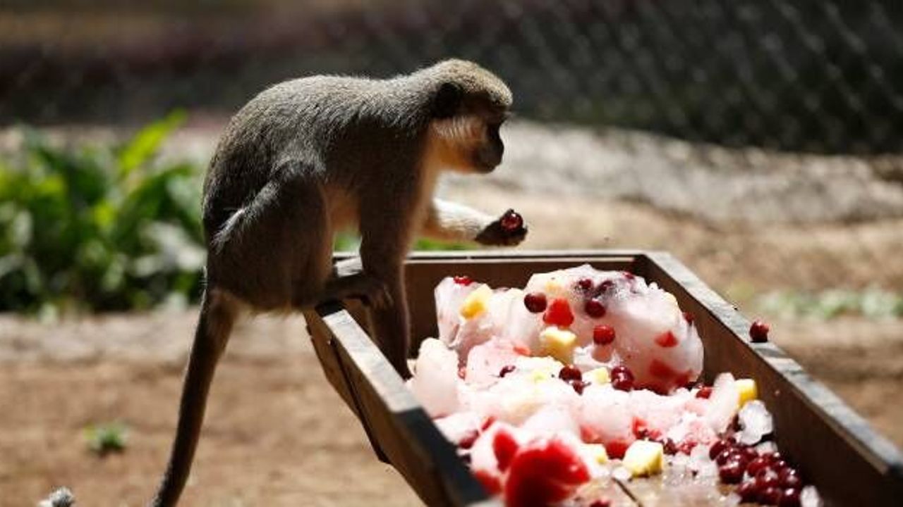 Sıcak hava dalgasının etkisi altına giren Antalya'daki doğal yaşam parkında kalan hayvanlar, havuz ve su fıskiyelerinin yanı sıra yaz diyetlerine uygun, kalorisi düşük meyvelerden oluşan buzlu meyve kokteyli ile serinletiliyor.