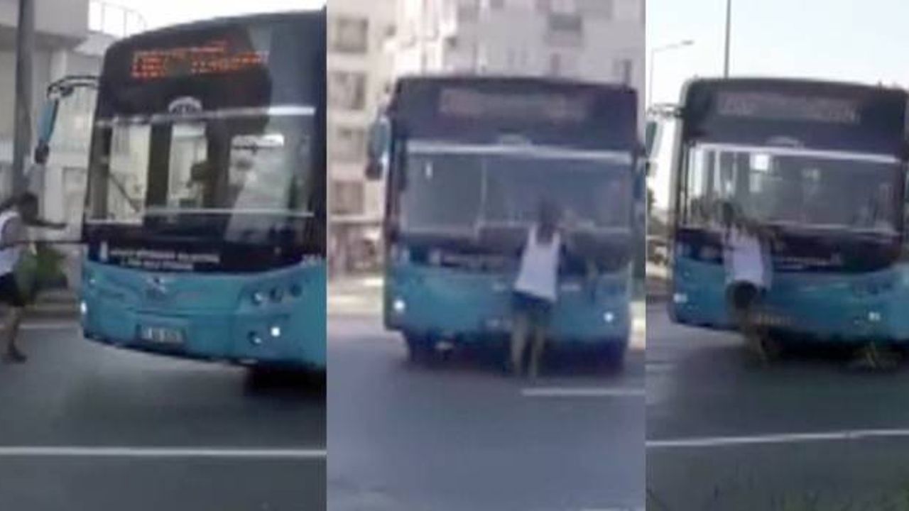 Antalya'da, Büyükşehir Belediyesi'ne bağlı özel halk otobüsüne maskesiz olduğu için alınmayan bir yolcu, seyir halindeki otobüsün önüne geçip, silecekleri tuttu. İşte cep telefonuna yansıya o görüntüler.